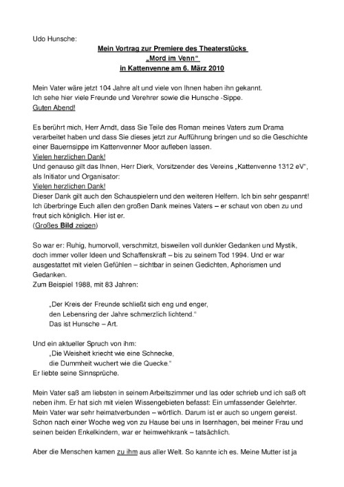 Karlheinz Arndt aus Kattenvenne hat dieses Theaterstück nach einem Roman von F. E. Hunsche in Scene gesetzt und mit dem Heckentheater in Kattenvenne aufgeführt. Es folgten fünf Wiederholungen.